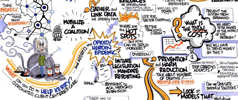 In order to focus these discussions as concretely as possible, the Stewards team devised a case study about a woman who, because of an auto accident, descended from a rewarding life as a gainfully employed mother and home-owner to an unnerving existence as a heroin addict, living in a shelter, whose children were removed from her custody and placed into foster care. This chilling scenario was based on actual experiences, which demonstrated that agency after agency lost opportunity after opportunity to prevent the many problems that occurred, to mitigate the damage, or to help in numerous other ways. Why? Because the agencies, across HHS and related domains such as education and criminal justice, were working in silos and therefore weren’t able to exchange potentially vital information with each other about the woman and her family. (Click here to see the graphic mural summarizing recommendations from the case study activity)