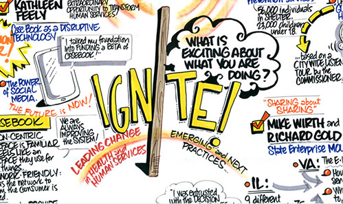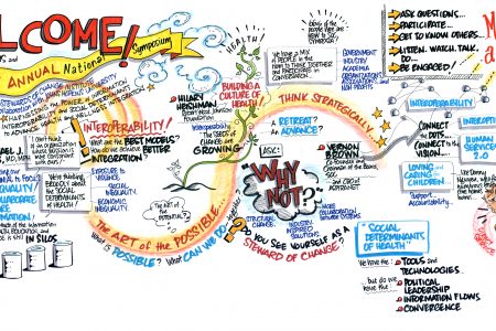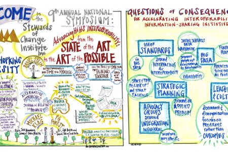 Stewards of Change Institute (SOCI) uses a powerful and highly effective tool to bring ideas to life and explain challenging concepts at our regional and national symposia, educational and training sessions, and other activities. We call it “vision mapping” because it charts a visual narrative that enables event participants to literally see – in real time – what they’ve been thinking and discussing. It is also one of the most engaging and productive techniques we use to help organizations generate learning and gain insights to inform their programmatic, organizational and/or strategic goals.