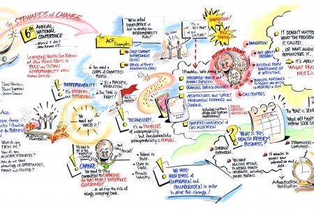 After the Interoperability Mural Gallery’s showings at the CIE Summit and the MESC, we are taking it to the Annual Connected Health Conference (CHC). This important event “is the global platform for provocative and forward-thinking discussion, deal-making opportunities and real-world perspectives.” With the understanding that interoperability is an increasingly significant element of healthcare and health IT, we chose murals for this event that are both highly relevant to the CHC audience and that demonstrate their value as a teaching-and-learning tool. They range from representations of how to create an organizational vision or strategic plan, to thought-provoking depictions of complex issues such as achieving racial equity in healthcare.